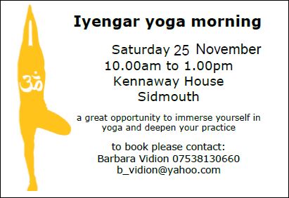 Iyengar Yoga Morning November 1, 2017November 1, 2017 | Barbara Vidion The next Iyengar yoga morning is in November… to book your place please contact me Share this: Click to share on X (Opens in new window) X Click to share on Facebook (Opens in new window) Facebook Like Loading... Related